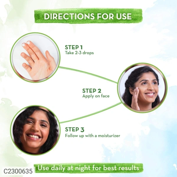 With time, the skin's cell turnover starts to slow down, causing the skin to lose its elasticity and becoming prone to discoloration and other signs of aging like wrinkles and fine lines. With a high concentration of antioxidants, retinol boosts collagen and increases cell turnover, reducing lines and wrinkles. Meanwhile, bakuchi helps alter mature skin cells' behavior, so they act more youthful. Regular use renews and revives aging skin, giving you an even skin tone and improving texture. The serum performs its repairing functions at night, and hence it's advisable to use this serum at night after cleansing and before going to sleep. It is suitable for all skin types and free of alcohol and harmful toxins such as parabens, mineral oil, silicones, etc.