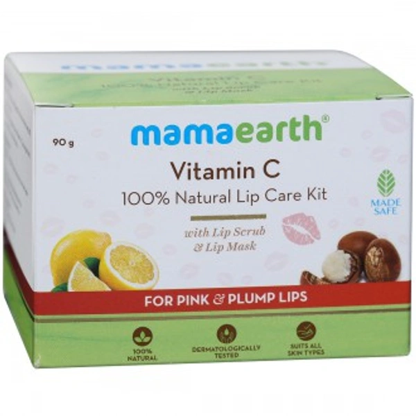 Want to go from dry and chapped lips to pink and plump ones? This is the natural lip care duo you need! Mamaearth Vitamin C 100% Natural Lip Care Kit is India's 1st Made Safe Certified lip kit. Crafted with the time-tested goodness of shea butter and the power of vitamin C, this kit gently exfoliates, lightens and nourishes for pink and plump lips. And because it's 100% natural, it's got no toxins or harmful chemicals and is extremely gentle. This is 2 in 1 kit has lip scrub which is further enriched with walnut shells that gently buffs away dryness and flaky skin on your lips. Use this as the first step and follow up with the lip mask that is enveloped in the natural goodness of turmeric oil which lightens and traps in moisture for pink and plump lips.