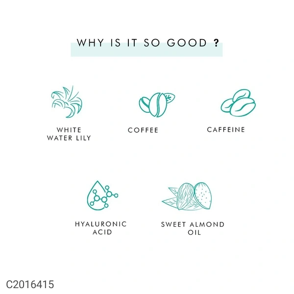 Composition: Pure Arabica Coffee, Caffeine, White Water Lily, Sweet Almond Oil, Hyaluronic Acid