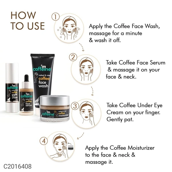 Package Contains: 1 Coffee Face Wash, 1 Coffee Face Serum, 1 Coffee Under Eye Cream, 1 Coffee Face Moisturizer