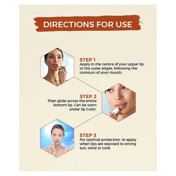 - For optimal protection, re-apply when lips are exposed to strong sun, wind or cold.