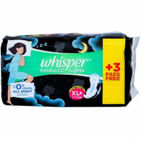 Whisper Bindazzz Nights Sanitary Pads - XL, Longer & Wider Back, Stops Leakage, Pack Of 27 pcs